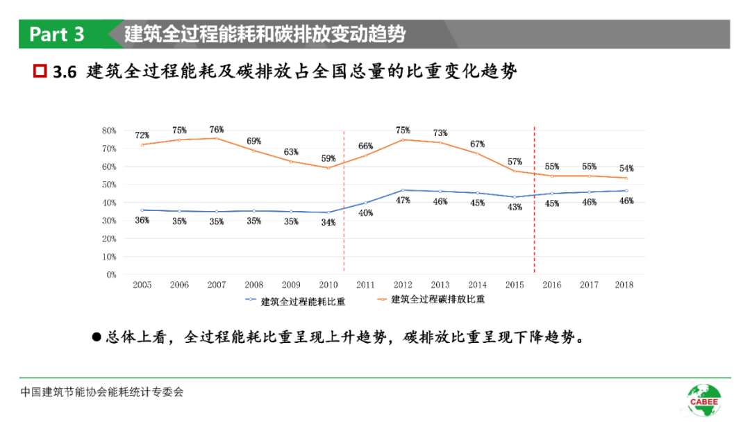 圖4:鋼鐵-化工-氫能一體化網(wǎng)絡(luò)集成智能制造資料來源:東北大學(xué)鋼鐵前沿技術(shù)研究院,遠(yuǎn)東資信整理三是建筑領(lǐng)域,目前城市碳排放的60%來源于建筑維持功能本身,構(gòu)建綠色建筑技術(shù)體系、發(fā)展低碳建筑極其重要,其關(guān)鍵是建筑規(guī)劃設(shè)計、建造、使用、運(yùn)行、維護(hù)、拆除和重新利用全過程的低碳控制優(yōu)化。如在建造環(huán)節(jié),可利用屋頂光伏發(fā)電技術(shù),實(shí)現(xiàn)自然光和燈光照明有效整合,可通過建造無動力屋頂通風(fēng)設(shè)備,調(diào)節(jié)風(fēng)流風(fēng)速并帶動風(fēng)機(jī)發(fā)電;在使用環(huán)節(jié),可通過種植屋頂花草建造“綠色屋頂”,不僅可達(dá)到降溫效果節(jié)省空調(diào)電力,還能吸收大氣污染物;在拆除環(huán)節(jié),可通過有效回收利用建筑廢棄物,防止發(fā)生二次污染。根據(jù)中國建筑節(jié)能協(xié)會發(fā)布《中國建筑能耗研究報告(2020)》?!堆芯繄蟾妗穼ㄖ^程能耗和碳排放的測算方法、數(shù)據(jù)分析以及碳中和目標(biāo)下建筑碳排放情景進(jìn)行了介紹。《研究報告》顯示,2005-2018年期間建筑全過程能耗比重呈現(xiàn)上升趨勢,碳排放比重呈現(xiàn)下降趨勢。2000-2018年全國能耗重心南移0.9度(緯度),碳排放重心南移1.1度(緯度),移動趨勢較為明顯。