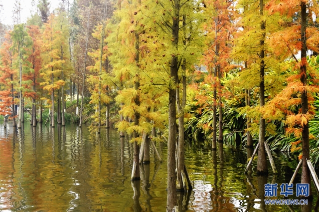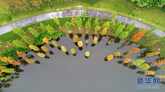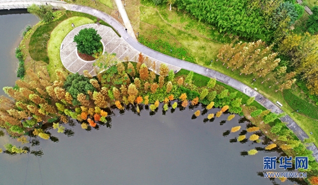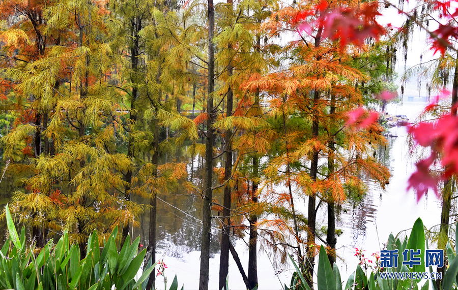 近日,重慶涪陵銅鼓湖公園披上多彩冬裝,紅、橙、黃、綠的植被繽紛交錯,微風(fēng)吹過,樹影倒映湖面,蕩起層層漣漪。新華網(wǎng)發(fā)(黃河 攝)