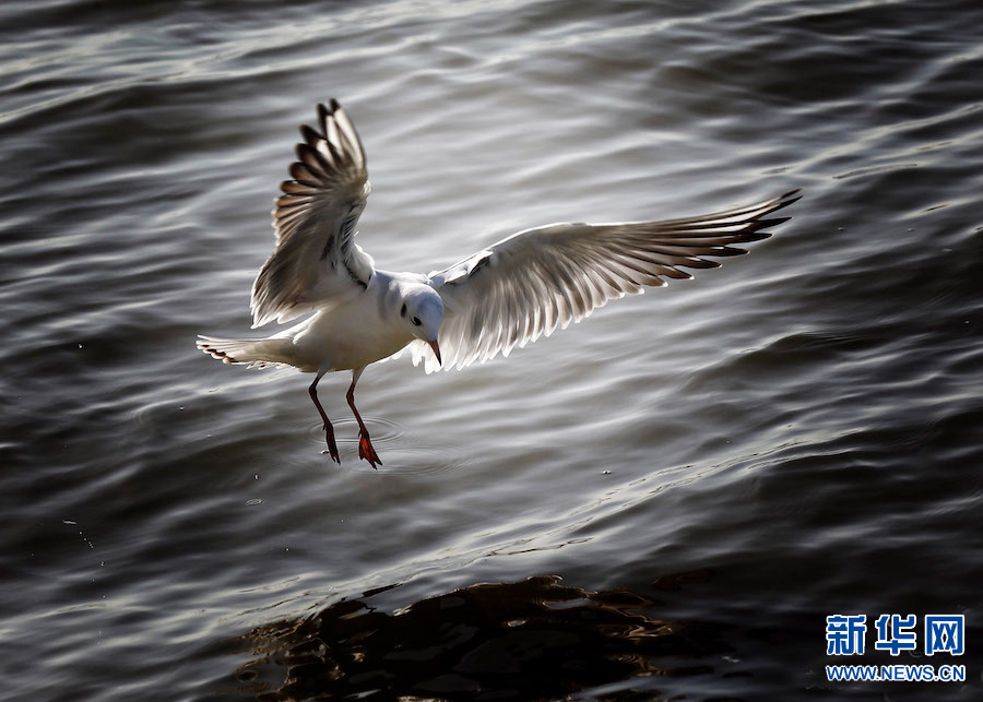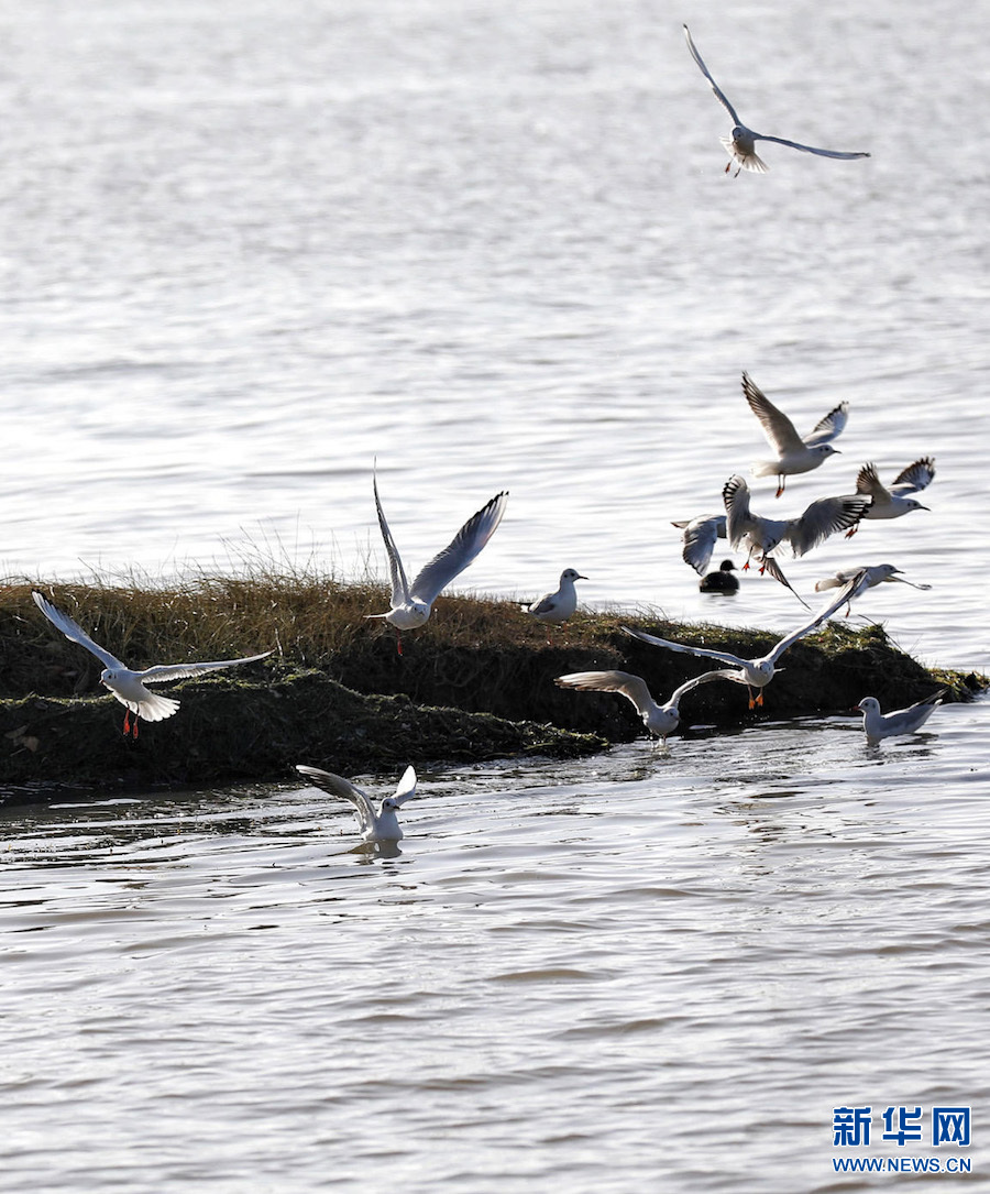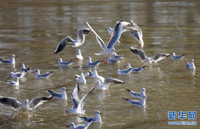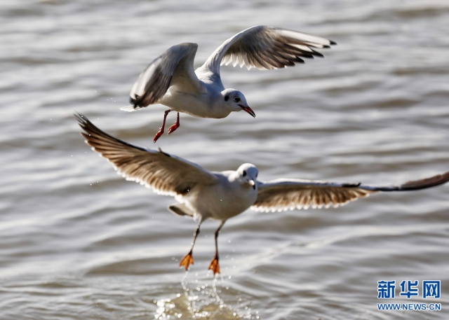 11月23日,河南省平頂山白龜湖國家濕地公園,紅嘴鷗在湖面上自由嬉戲覓食。