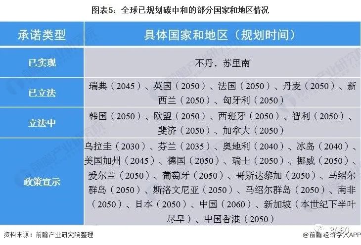 以上數(shù)據(jù)參考前瞻產(chǎn)業(yè)研究院《中國碳中和產(chǎn)業(yè)市場前瞻與投資戰(zhàn)略規(guī)劃分析報告》目前,全球已有超過120個國家和地區(qū)提出了碳中和目標(biāo)。其中,大部分計劃在2050年實現(xiàn),如歐盟、英國、加拿大、日本、新西蘭、南非等。美國總統(tǒng)拜登已明確表示,將承諾在2050年實現(xiàn)碳中和。一些國家計劃實現(xiàn)碳中和的時間更早。如烏拉圭提出2030年實現(xiàn)碳中和、芬蘭2035年,冰島和奧地利2040年,瑞典2045年,蘇里南和不丹已經(jīng)分別于2014年和2018年實現(xiàn)了碳中和目標(biāo),進入負(fù)排放時代。中國近期宣布爭取在2060年前實現(xiàn)碳中和。