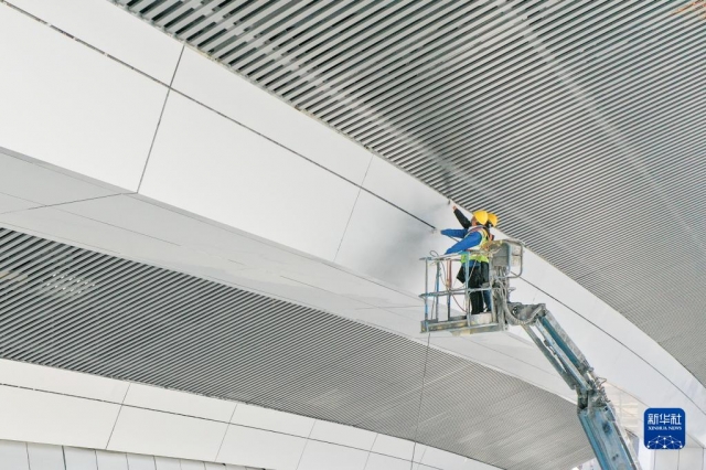 11月30日,施工人員在江蘇鹽城黃海濕地博物館金屬屋面工程現(xiàn)場進行檢查(無人機照片)。