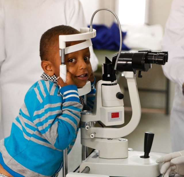 ↑ 2014年5月2日,在埃塞俄比亞首都亞的斯亞貝巴的阿勒特醫(yī)院,一名小朋友等待參加“光明行”活動(dòng)的中國(guó)眼科專家為他看診。
