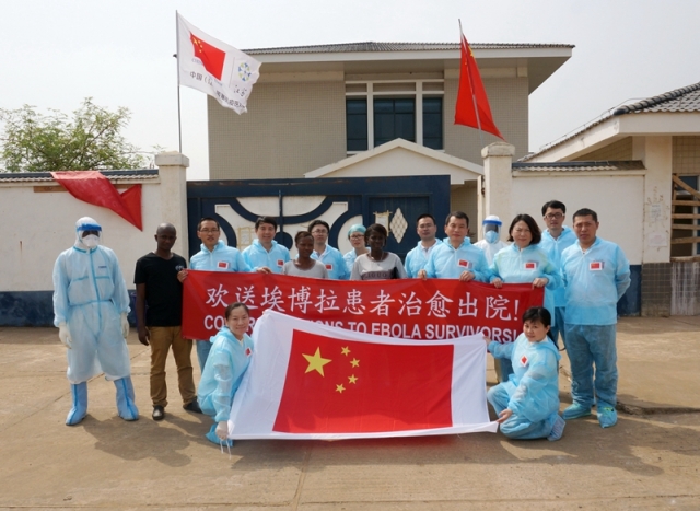 ↑ 2015年4月4日,在塞拉利昂首都弗里敦市郊的中塞友好醫(yī)院埃博拉診療中心,中國(guó)醫(yī)療隊(duì)隊(duì)員與兩名被治愈的埃博拉出血熱患者(中)合影留念。