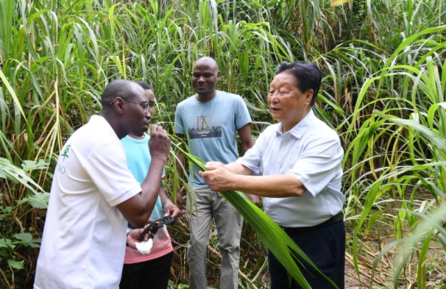 ↑ 2021年8月12日,福建農(nóng)林大學(xué)國(guó)家菌草工程技術(shù)研究中心首席科學(xué)家林占熺(右一)在福建農(nóng)林大學(xué)菌草園讓尼日利亞留學(xué)生試嘗幼嫩菌草的味道。