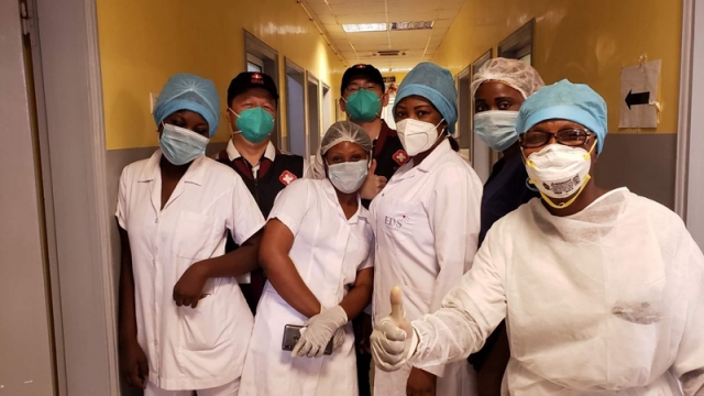 ↑ 2020年5月26日,中國(guó)抗疫醫(yī)療專家組在剛果(布)首都布拉柴維爾指導(dǎo)新冠肺炎病房建設(shè)時(shí),與當(dāng)?shù)匾痪€醫(yī)務(wù)人員合影。