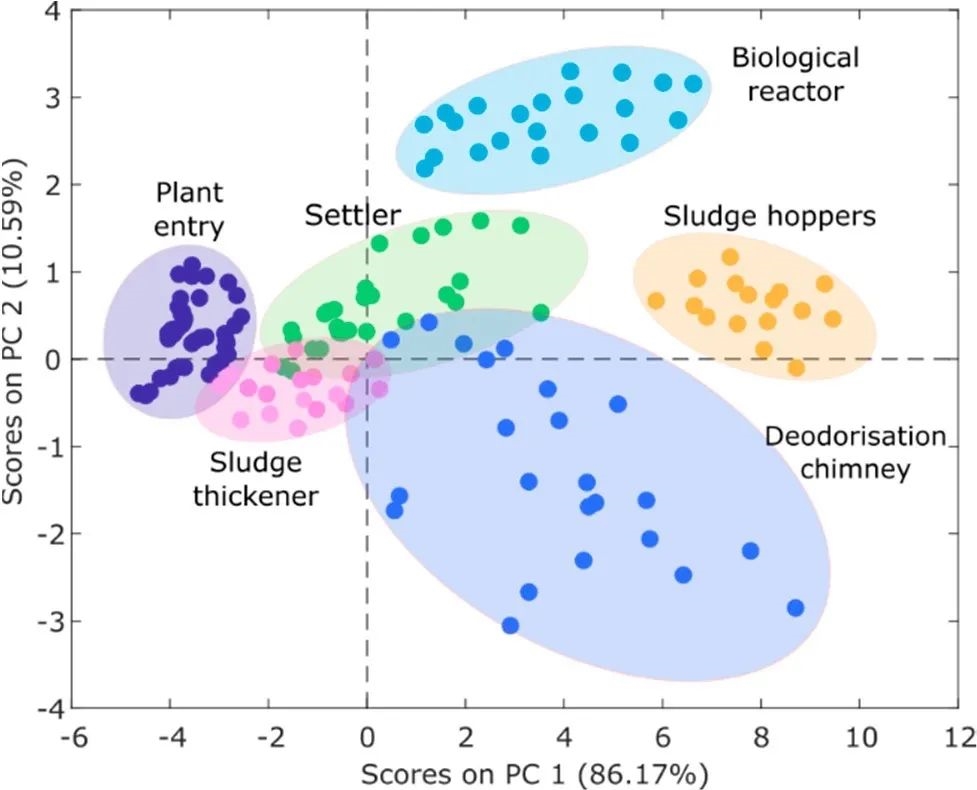 使用無(wú)人機(jī)的另一個(gè)優(yōu)點(diǎn)是便于繪制臭氣地圖。通過(guò)PCA主成分分析,污水廠可以更直觀地了解不同地點(diǎn)的臭氣源類型: