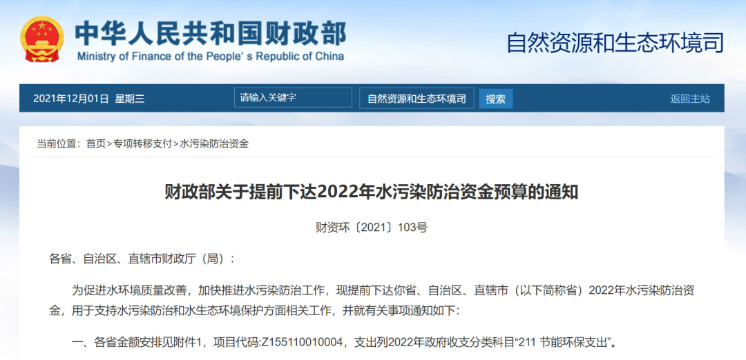 11月17日,財(cái)政部發(fā)布《關(guān)于提前下達(dá)2022年水污染防治資金預(yù)算的通知》,對2022年的水污染防治資金做了安排。