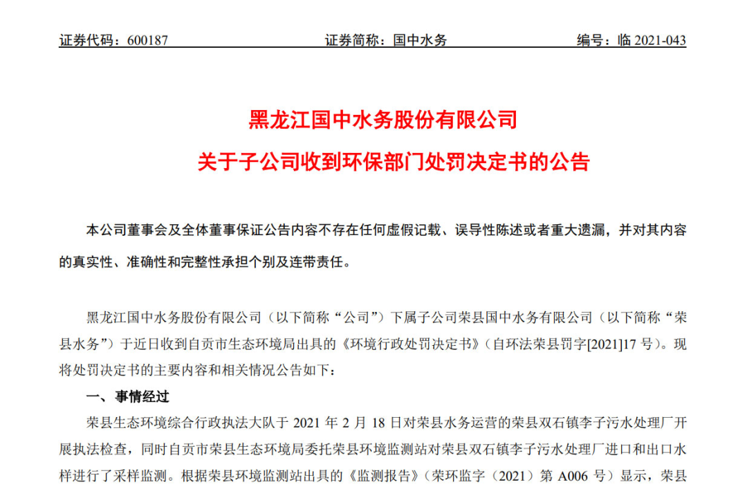 11月25日,國中水務(600187.SH)發(fā)布公告稱,其下屬子公司榮縣國中水務有限公司(下稱“榮縣國中水務”)因為“進水超標導致的出水超標及執(zhí)行標準認定問題”,被罰共計85.70萬元。
