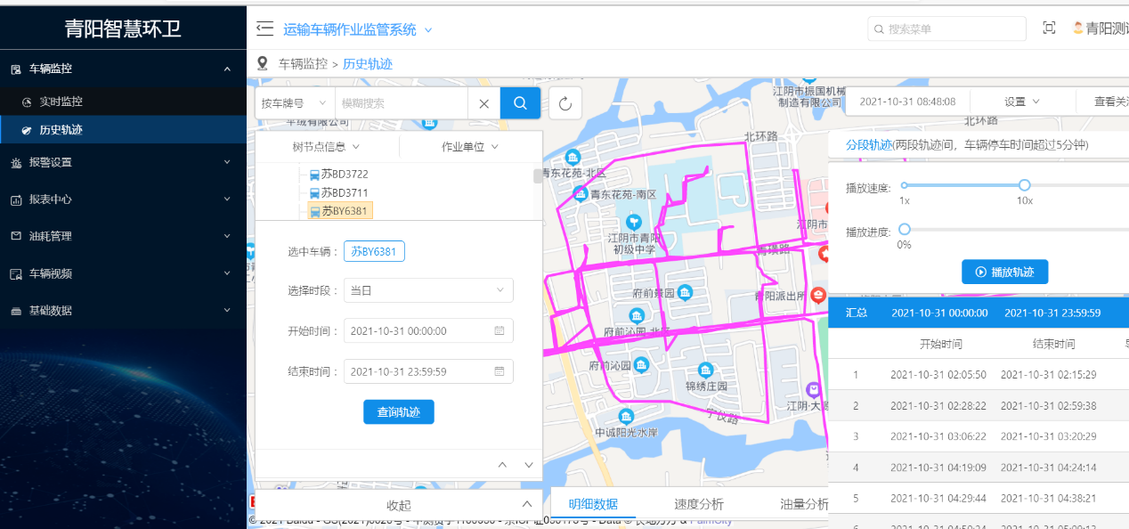 通過對環(huán)衛(wèi)作業(yè)人員、時(shí)間、地點(diǎn)、設(shè)備使用情況等各種數(shù)據(jù)的統(tǒng)計(jì)和分析,不僅能夠幫助管理者從全局把控環(huán)衛(wèi)概況,還可為后續(xù)指揮決策提供系統(tǒng)的數(shù)據(jù)支撐,保證決策的高效性和科學(xué)性。