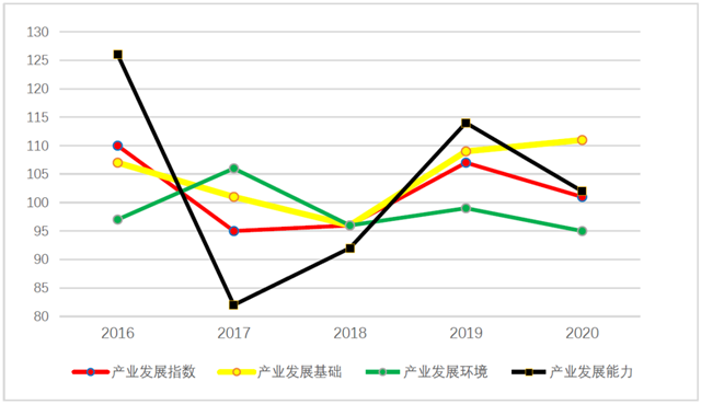 圖2“十三五”期間我國環(huán)保產(chǎn)業(yè)發(fā)展指數(shù)及一級(jí)指標(biāo)變化趨勢(shì)