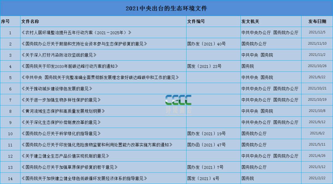 2021年是“十四五”開(kāi)局年,也是碳中和元年,注定大風(fēng)不斷。一年來(lái),中央有關(guān)生態(tài)環(huán)保相關(guān)的重要文件已經(jīng)陸續(xù)亮相,國(guó)家對(duì)今后一段時(shí)間減污降碳、綠色發(fā)展等重點(diǎn)工作進(jìn)行了系列部署。本文整理匯編了今年來(lái)中央出臺(tái)的生態(tài)環(huán)境相關(guān)文件,并摘取官方重點(diǎn)解讀內(nèi)容,以饗讀者,后續(xù)還將推出部委及地方生態(tài)環(huán)境文件匯編,敬請(qǐng)期待。根據(jù)商會(huì)不完全統(tǒng)計(jì),中央今年已經(jīng)出臺(tái)的生態(tài)環(huán)境相關(guān)文件共計(jì)14部,包括《關(guān)于深入打好污染防治攻堅(jiān)戰(zhàn)的意見(jiàn)》、《農(nóng)村人居環(huán)境整治提升五年行動(dòng)方案(2021-2025年)》、《黃河流域生態(tài)保護(hù)和高質(zhì)量發(fā)展規(guī)劃綱要》、《國(guó)務(wù)院關(guān)于加快建立健全綠色低碳循環(huán)發(fā)展經(jīng)濟(jì)體系的指導(dǎo)意見(jiàn)》等,其中也包括深刻影響社會(huì)經(jīng)濟(jì)發(fā)展的碳中和頂層文件《國(guó)務(wù)院關(guān)于印發(fā)2030年前碳達(dá)峰行動(dòng)方案的通知》《國(guó)務(wù)院關(guān)于印發(fā)2030年前碳達(dá)峰行動(dòng)方案的通知》等,關(guān)鍵詞為“綠色”“生態(tài)”“低碳”。