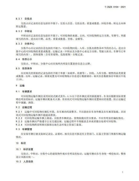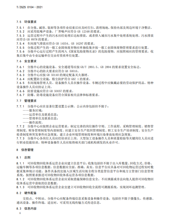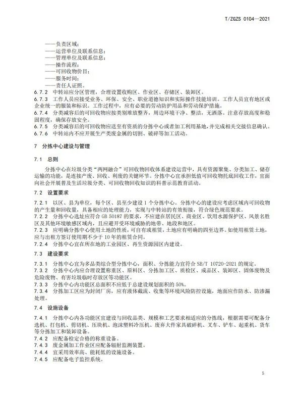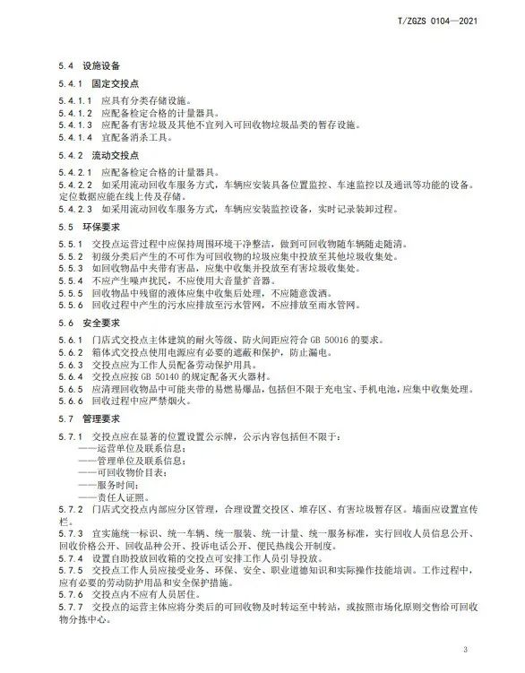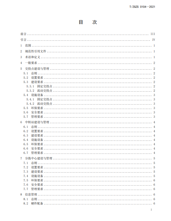 本標(biāo)準(zhǔn)立足于生活垃圾分類和廢舊物資循環(huán)利用體系構(gòu)建要求,結(jié)合再生資源回收行業(yè)運行特點和當(dāng)前可回收物體系構(gòu)建的實踐,提出了可回收物體系中交投點、中轉(zhuǎn)站、分揀中心以及信息管理體系建設(shè)的相關(guān)要求,以更好提升可回收物回收體系運行效率,促進(jìn)垃圾減量和資源有效利用。本標(biāo)準(zhǔn)主要包含以下內(nèi)容:目次、前言、引言、范圍、規(guī)范性引用文件、術(shù)語和定義、一般要求、交投點建設(shè)與管理、中轉(zhuǎn)站建設(shè)與管理、分揀中心建設(shè)與管理、信息管理、運輸、標(biāo)識。