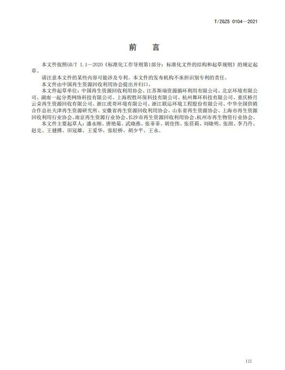 本標(biāo)準(zhǔn)起草單位包括中國再生資源回收利用協(xié)會、江蘇斯瑞資源循環(huán)利用有限公司、北京環(huán)境有限公司、湖南一起分類網(wǎng)絡(luò)科技有限公司、上海程勝環(huán)保科技有限公司、杭州舞環(huán)科技有限公司、重慶橋月云朵再生資源回收有限公司、浙江虎哥環(huán)境有限公司、浙江聯(lián)運環(huán)境工程股份有限公司、中華全國供銷合作總社天津再生資源研究所、安徽省再生資源回收利用協(xié)會、山東省再生資源協(xié)會、上海市再生資源回收利用行業(yè)協(xié)會、南京再生資源行業(yè)協(xié)會、長沙市再生資源回收利用協(xié)會、杭州市再生物資行業(yè)協(xié)會。
