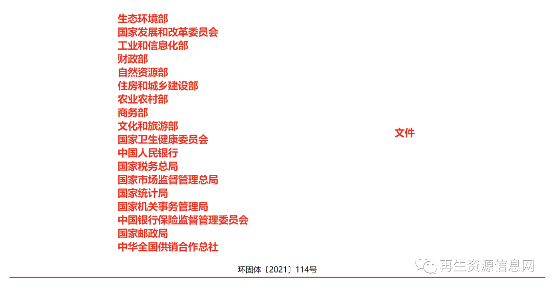 各省、自治區(qū)、直轄市及新疆生產(chǎn)建設(shè)兵團(tuán)生態(tài)環(huán)境廳(局)、發(fā)展改革委、工業(yè)和信息化主管部門、財(cái)政廳(局)、自然資源主管部門、住房和城鄉(xiāng)建設(shè)廳(委、局、城管委、城管局、綠化市容局)、農(nóng)業(yè)農(nóng)村(農(nóng)牧、畜牧、獸醫(yī)、漁業(yè))廳(局、委)、商務(wù)主管部門、文化和旅游廳(局)、衛(wèi)生健康委、市場(chǎng)監(jiān)管局(廳、委)、統(tǒng)計(jì)局、機(jī)關(guān)事務(wù)管理部門、郵政局、供銷合作社;中國(guó)人民銀行上海總部,各分行、營(yíng)業(yè)管理部,各省會(huì)(首府)城市中心支行;國(guó)家稅務(wù)總局各省、自治區(qū)、直轄市、計(jì)劃單列市稅務(wù)局;各銀保監(jiān)局: