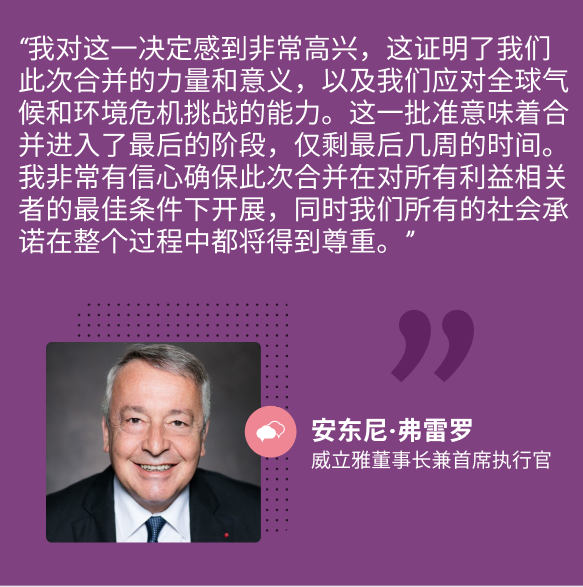 威立雅已與歐盟委員會進行密切合作,以解決所有與競爭相關(guān)的問題:首先,在威立雅與第三方聯(lián)合體就為成立新蘇伊士而達成的商業(yè)協(xié)議中,剝離了大部分被歐盟委員會判定存在競爭問題的資產(chǎn)。這份商業(yè)協(xié)議與Meridiam、GIP 、 La Caisse des Dép?ts/CNP Assurances 組成的投資者聯(lián)合體簽署,協(xié)議內(nèi)容體現(xiàn)在威立雅和蘇伊士于2021年4月簽署的合并協(xié)議和2021年10月22 日簽署的購買協(xié)議中。合并完成后,新蘇伊士的營業(yè)收入接近70億歐元,包括蘇伊士在法國的水務(wù)與資源回收業(yè)務(wù),在意大利、中歐、非洲(包括摩洛哥)、中亞、印度、中國和澳大利亞的國際資產(chǎn),以及全球數(shù)字和環(huán)境業(yè)務(wù)。其次,為滿足歐盟委員會對某些其他市場的要求,威立雅還在工業(yè)水、移動解決方案和特殊工業(yè)廢物領(lǐng)域給予了一些額外的補救措施。鑒于以19.85 歐元/每股的價格要約收購蘇伊士股份的唯一先決條件已經(jīng)獲得滿足,隨著收購要約的截止日期經(jīng)法國競爭管理局AMF確定為2022年1月7日威立雅和蘇伊士之間的合并進入最后階段。據(jù)悉,目前擬議的合并已獲得18個國家和地區(qū)主管機構(gòu)中15個的批準,還有智利、英國和澳大利亞的競爭主管機構(gòu)仍在審查中。作為迄今為止全球環(huán)境領(lǐng)域最大的一筆交易,威立雅與蘇伊士的合并倍受矚目。