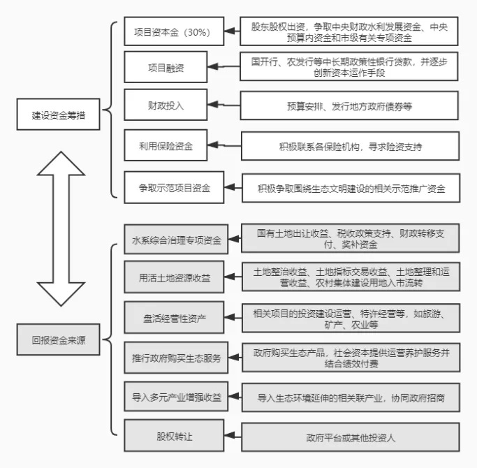 在資金構(gòu)成方面,本項(xiàng)目資本金30%,由社會資本按照股權(quán)比例出資;同時也積極爭取各級專項(xiàng)資金(如中央財政水利發(fā)展資金)注入,以提高項(xiàng)目資本金比例。項(xiàng)目融資占70%,一方面通過國開行、農(nóng)發(fā)行等政策性銀行中長期貸款獲得中長期優(yōu)惠性利率融資;另一方面,也在尋求險資支持,通過基礎(chǔ)設(shè)施債權(quán)投資計劃獲得中長期險資融資;此外,積極爭取圍繞生態(tài)文明建設(shè)的示范項(xiàng)目推廣資金作為額外補(bǔ)足。