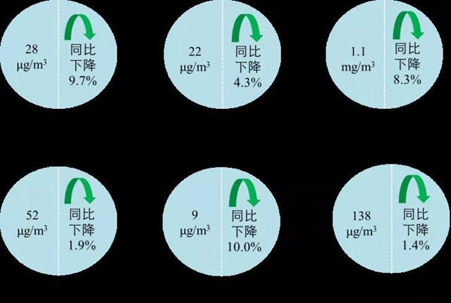 1-11月,全國339個地級及以上城市平均優(yōu)良天數(shù)比例為87.6%,同比下降0.3個百分點(diǎn);PM2.5平均濃度為28微克/立方米,同比下降9.7%;PM10平均濃度為52微克/立方米,同比下降1.9%;O3平均濃度為138微克/立方米,同比下降1.4%;SO2平均濃度為9微克/立方米,同比下降10.0%;NO2平均濃度為22微克/立方米,同比下降4.3%;CO平均濃度為1.1毫克/立方米,同比下降8.3%。