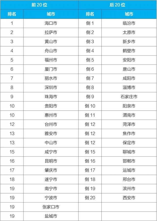 2021年11月168個重點(diǎn)城市空氣質(zhì)量排名前20位和后20位城市名單