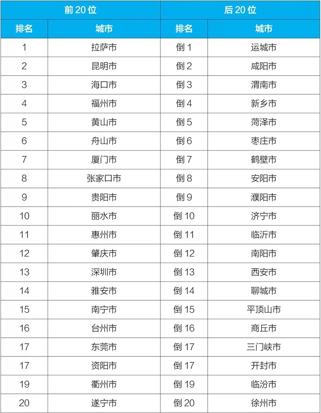 11月,168個重點(diǎn)城市中,拉薩、昆明和??诘?0個城市空氣質(zhì)量相對較好(從第1名至第20名),運(yùn)城、咸陽、渭南等20個城市空氣質(zhì)量相對較差(從倒數(shù)第1名至倒數(shù)第20名),見附表3。