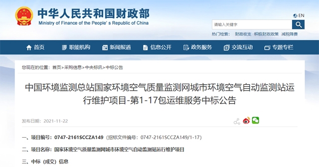 從11月22日,國家財政部公布的中國環(huán)境監(jiān)測總站國家環(huán)境空氣質(zhì)量監(jiān)測網(wǎng)城市環(huán)境空氣自動監(jiān)測站運行維護項目第1-17包運維服務(wù)中標(biāo)公告重可以看出,共有10家企業(yè)中標(biāo),7家企業(yè)連拿兩包。其中,安徽藍盾光電子股份有限公司中標(biāo)金額最高,中標(biāo)了第3包和第5包,中標(biāo)金額分別為1942.128萬元和1940.328萬元。其次是廈門隆力德環(huán)境技術(shù)開發(fā)有限公司中標(biāo)了第1包和第4包,中標(biāo)金額分別為1815.9156萬元和1918.08萬元。