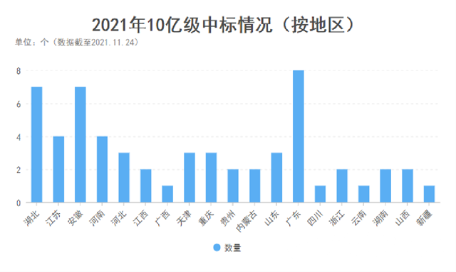 而從區(qū)域來看,廣東、湖北、安徽10億+標(biāo)的數(shù)量名列前三,江蘇、河南、河北、天津、重慶、山東等也有數(shù)個(gè)10億+標(biāo)的被拿下,區(qū)域市場(chǎng)熱度可見一斑。