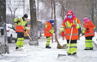 黑龍江省哈爾濱市的環(huán)衛(wèi)工人在街道上進(jìn)行清雪作業(yè)。新華社記者 王建威攝