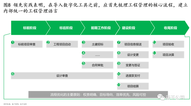 根據(jù)辰于經(jīng)驗(yàn),讓人倍受鼓舞的是,工程管理的數(shù)字化轉(zhuǎn)型是相對(duì)容易實(shí)現(xiàn)的,成效也相對(duì)很快。工程管理經(jīng)常涉及到大量數(shù)字、計(jì)算,這些工作對(duì)于計(jì)算機(jī)是容易的,而且工程管理較為模塊化,在數(shù)字化的實(shí)現(xiàn)上也會(huì)相對(duì)容易,其他行業(yè)已經(jīng)有成功產(chǎn)品。不過在導(dǎo)入數(shù)字化工具之前,梳理工程管理的核心流程、建立內(nèi)部統(tǒng)一的工程管理語言是非常必要的(見圖8)。