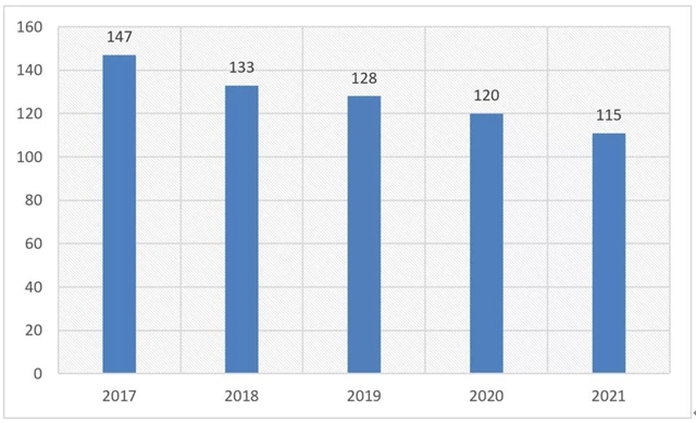 據(jù)不完全統(tǒng)計(jì), 2021年噪聲與振動(dòng)控制行業(yè)產(chǎn)值約為115億元, 與上年相比有所下降,各類(lèi)污染防治產(chǎn)值情況見(jiàn)表1。近五年來(lái),噪聲與振動(dòng)控制領(lǐng)域的總產(chǎn)值情況如圖1所示。
