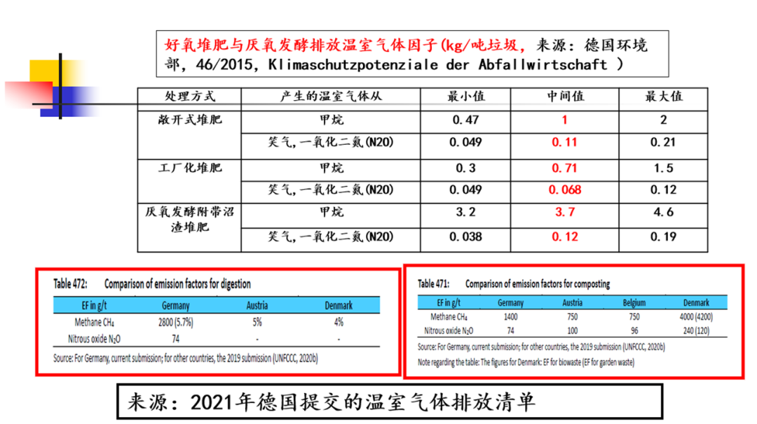 從歐盟提交給聯(lián)合國的數(shù)據(jù)來看,厭氧消化實際是增加溫室氣體的排放。歐洲的專家既然了解這個現(xiàn)實,為何還要到包括中國在內(nèi)的發(fā)展中國家來建議要做有機垃圾的厭氧或堆肥呢?其實背后也有更深層次的原因,一方面發(fā)展中國家財政實力相對較弱,難以普遍負擔(dān)高成本的垃圾焚燒發(fā)電。而另一方面在降污和減碳的雙重壓力下又切實需要減少有機垃圾的直接填埋。在這種復(fù)雜情況下,將有機垃圾分出一部分做厭氧或堆肥,實際還是能夠達到一定減排的效果。下圖中展示的是德國提交的溫室氣體排放清單中厭氧或堆肥工藝過程中,一噸有機垃圾處理排放的二氧化碳當量。