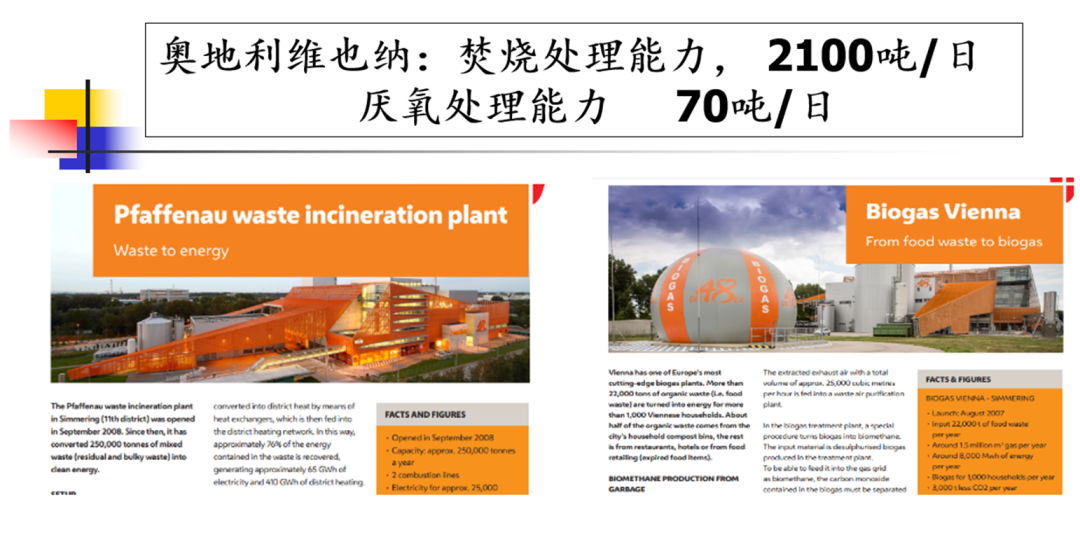 上圖是奧地利維也納的一個垃圾焚燒發(fā)電廠??梢钥吹皆摲贌龔S的一端有一個厭氧消化裝置,這個厭氧裝置主要處理從家庭分出來的廚余垃圾。我國的垃圾焚燒發(fā)電廠都有滲濾液處理裝置,且配置的比例遠遠大于圖中焚燒發(fā)電廠。圖中焚燒發(fā)電廠的焚燒能力是2100噸/日,其對應(yīng)的厭氧處理能力僅是70噸/日。而國內(nèi)2100噸/日的垃圾焚燒發(fā)電廠配的厭氧規(guī)模以垃圾處理規(guī)模的20%計也超過400噸/日。
