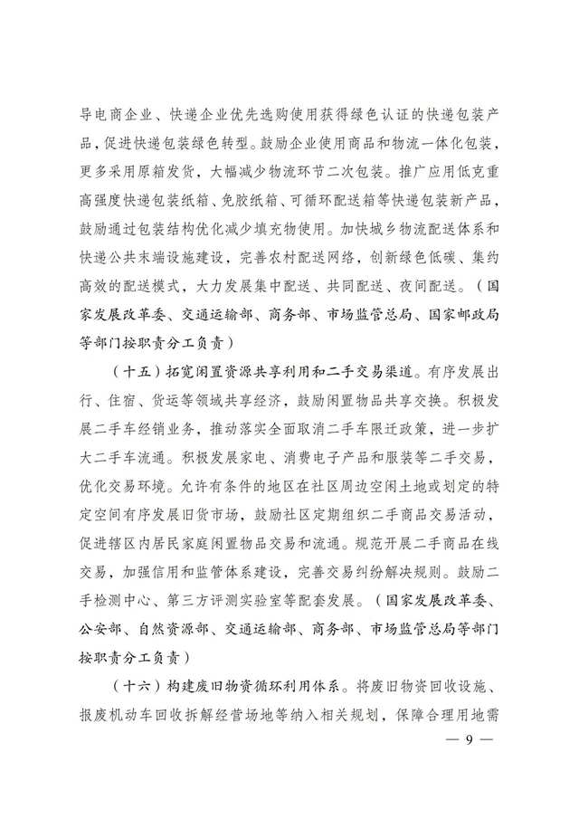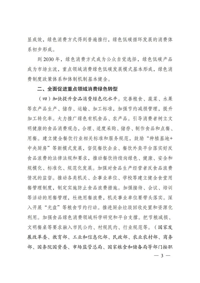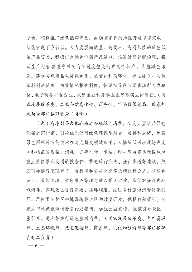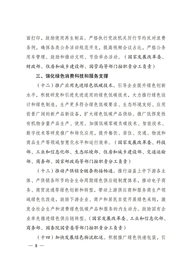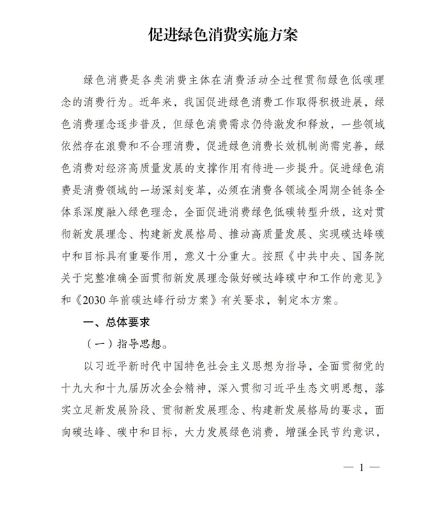 為深入貫徹落實《中共中央、國務(wù)院關(guān)于完整準(zhǔn)確全面貫徹新發(fā)展理念做好碳達(dá)峰碳中和工作的意見》和《2030年前碳達(dá)峰行動方案》有關(guān)要求,根據(jù)碳達(dá)峰碳中和工作領(lǐng)導(dǎo)小組部署安排,國家發(fā)展改革委、工業(yè)和信息化部、住房和城鄉(xiāng)建設(shè)部、商務(wù)部、市場監(jiān)管總局、國管局、中直管理局會同有關(guān)部門研究制定了《促進綠色消費實施方案》。現(xiàn)印發(fā)給你們,請結(jié)合實際,認(rèn)真抓好貫徹落實。
