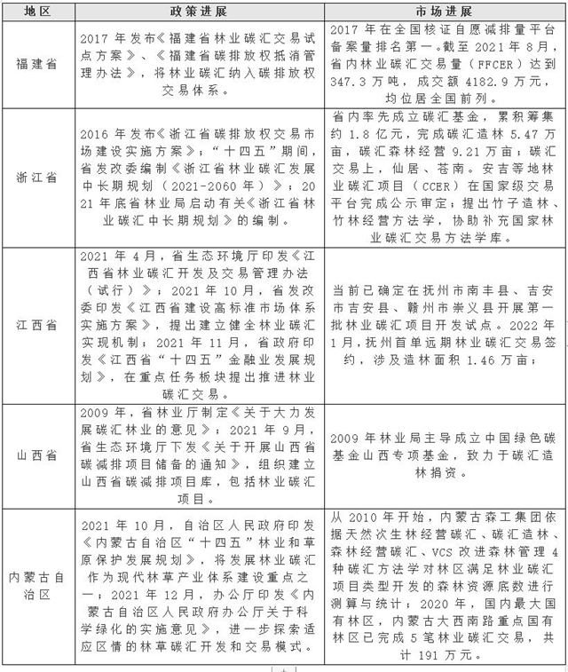 地方上,我國于2004年便啟動林業(yè)碳匯項目試點,在江西、福建、浙江、內蒙古、遼寧等省份開展了項目的實踐落地。一方面,各省市利用既有方法學進行本地林業(yè)碳匯資源本底調查;另一方面,基于自身林業(yè)資源優(yōu)勢,各試點紛紛開展碳匯項目的政策性研究和市場布局。如下表所示,以林草資源豐富的福建、浙江、內蒙古等省份為首,在全國核證自愿減排市場暫時停止交易的時段里持續(xù)開展碳匯項目方法學的研究以及地方市場建設,為未來全國性林業(yè)碳匯交易融通打下堅實基礎。