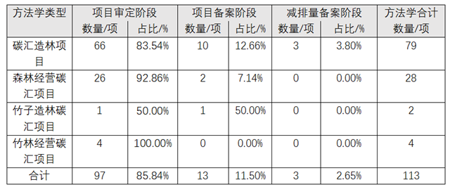 根據相關研究統(tǒng)計,整體上,在CCER市場尚未暫停的時段里,全國總計有97個項目進入項目審定階段,13個項目進入備案階段,3個項目實現減排量備案;在碳匯項目方法學統(tǒng)計中,碳匯造林項目方法學占比最高,其進入審定階段的項目量亦居首。