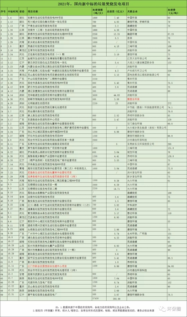 本文將從日處理規(guī)模、總投資、項(xiàng)目分布的省份、中標(biāo)企業(yè)等幾個(gè)角度,對(duì)2021年國內(nèi)新中標(biāo)的垃圾焚燒項(xiàng)目做出全面細(xì)致的梳理,并試著從具體項(xiàng)目及企業(yè)動(dòng)態(tài)中總結(jié)出行業(yè)的幾大變化趨勢,僅供參考。