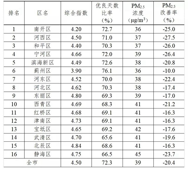 注:1、排名按照各區(qū)PM2.5濃度、PM2.5改善率和優(yōu)良天數比率排名位次數值各占30%、30%和40%權重統(tǒng)計;2、綜合指數越小,表明空氣質量越好;3、改善率負數表示同比改善,正數表示同比惡化。