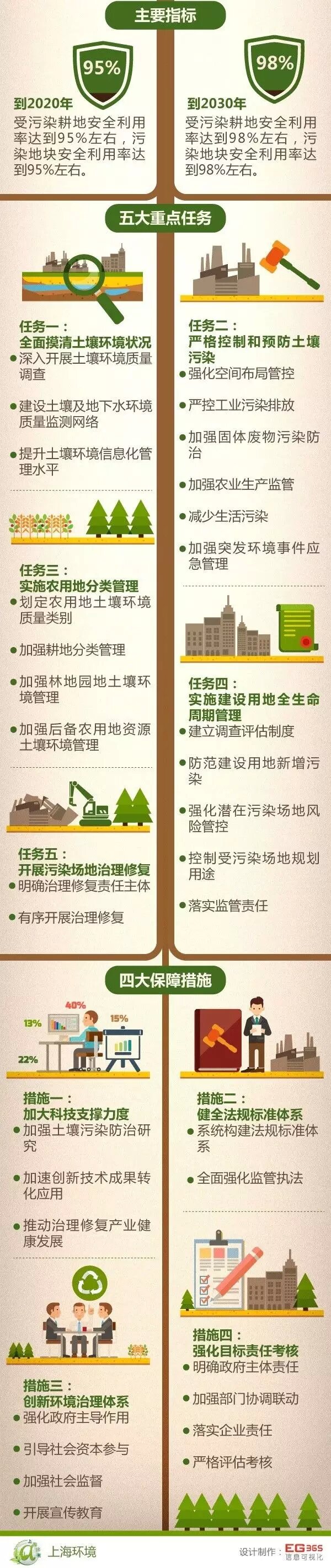 《實(shí)施方案》圍繞一個(gè)總體目標(biāo),緊扣五大重點(diǎn)任務(wù),落實(shí)四大保障措施,共提出10條、33款措施內(nèi)容和具體任務(wù),對(duì)上海土壤污染防治工作做出了全面戰(zhàn)略部署,這是當(dāng)前和今后一段時(shí)期上海土壤污染防治工作的行動(dòng)綱領(lǐng)。