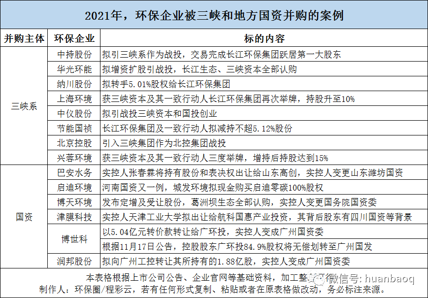 深:影響之深為近年來之最,去年發(fā)生的88起收并購,從某種意義上講已經(jīng)不是某些企業(yè)的戰(zhàn)略進與退,也不是傳統(tǒng)行業(yè)跨界環(huán)保這樣簡單,它背后傳遞的信號有央企、國資、民企、外企四股力量的競爭更迭,也有行業(yè)最徹底洗牌、低負債對高負債的清算等,意味深遠。并購頻率之多、交易金額之大,波及范圍之廣,產(chǎn)業(yè)影響之深,讓2021年環(huán)保產(chǎn)業(yè)收并購更加有看頭。在這一年里,我們不僅見證了世界級環(huán)保巨頭“老大并購老二”的一波三折,也領(lǐng)略了三峽、地方國資進擊環(huán)保行業(yè)的“兇猛”,還看到了部分民企賣資產(chǎn),國資接盤“混改”大潮的落幕。從2020年8月,威立雅首次提出要收購蘇伊士股份起,直到2021年12月14日,歐盟委員會正式批準(zhǔn)二者收購交易,這場歷時1年零三個月,震驚環(huán)保圈的收購大案也進入收尾階段。最終的收購價,威立雅同意以每股20.50歐元的價格收購蘇伊士股份,要比最初的每股15歐元的報價加價不少。(詳情查閱:威立雅蘇伊士簽署合并協(xié)議,“洋水務(wù)”劍指中國市場?)去年6月,中國天楹宣布要15億歐元(折合人民幣約115億元)出售Urbaser 100%股權(quán),9月底就走完了各項流程,10月中下旬就披露完成了所有交割事項,速度非???,絲毫不拖泥帶水。對于這場收購案,媒體評價大都是正面,甚至有的還說中國天楹“里外躺贏”,在持有Urbaser的這些年中,中國天楹不僅在技術(shù)提升、產(chǎn)業(yè)鏈布局、海外業(yè)務(wù)、品牌影響力等方面獲益匪淺,而且通過買賣騰挪,中間除了掙了3.5億歐元投資差價之外,還把公司資產(chǎn)負債率,商譽減值風(fēng)險都降低了,簡直是人生贏家。(詳情查閱:中國天楹擬15億歐元出售Urbaser,賠了or賺了?)“一波三折”的城發(fā)環(huán)境換股吸收合并啟迪環(huán)境案,從去年年初一直持續(xù)到8月,才經(jīng)過河南省財政廳及河南省國資委正式批復(fù),中間較為突破的是6月份,城發(fā)環(huán)境宣布擬12.8億元并購啟迪環(huán)境相關(guān)資產(chǎn),其中擬定10億元收購鄭州啟迪零碳100%股權(quán),2.81億元收購武漢啟迪生態(tài)所持的5家下屬公司95%股權(quán)。帶著政治任務(wù)而來的三峽集團,近兩年不斷擴大自己“朋友圈”,一旦被其看上,輕則舉牌增持股份,比如興蓉環(huán)境、上海環(huán)境就多次獲其增持;重則引入戰(zhàn)投,躍居大股東,比如中持,享受項目、訂單上的傾斜。據(jù)筆者不完全統(tǒng)計,2021年,三峽系通過三峽資本以及一致行動人長江生態(tài)環(huán)保集團,引戰(zhàn)投、舉牌增持上市環(huán)企高達8家,其中不僅有北控水務(wù)、上海環(huán)境、中持股份、興蓉環(huán)境等水務(wù)龍頭,還有華光環(huán)能、納川股份、中儀股份等細分領(lǐng)域的“強兵悍將”。最后的這個,不是某一家環(huán)保企業(yè),而是一類環(huán)保企業(yè)。從2018年起,環(huán)保行業(yè)的“混改潮”已經(jīng)持續(xù)了好幾年。本以為這場上市民企易主、國資混改的悲情大戲就要完結(jié)了,誰知去年還是斷斷續(xù)續(xù)有地方國資接盤上市民企案發(fā)生,兜兜轉(zhuǎn)轉(zhuǎn),博世科、巴安水務(wù)、博天環(huán)境、潤邦股份、啟迪環(huán)境終于在去年成功聯(lián)姻國資,抱上了金主大腿。▼圖五:三峽系和地方國資增持并購環(huán)保案例