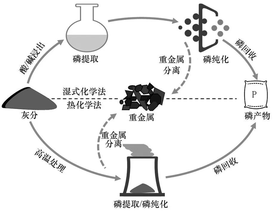 濕式化學(xué)法磷提取是通過直接投加酸或堿溶液,改變灰分酸堿環(huán)境,以增大磷的溶解度,使磷由固相轉(zhuǎn)移至液相。之后,將溶解磷與重金屬分離后得到具有附加值的磷產(chǎn)品。