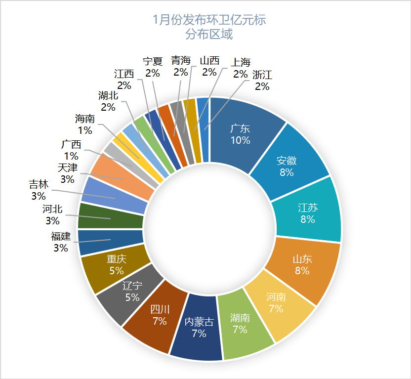 1月份已發(fā)布的60個(gè)環(huán)衛(wèi)億元標(biāo)分布于23個(gè)省份,其中廣東、安徽、江蘇、山東、河南、湖南、內(nèi)蒙古、四川發(fā)布項(xiàng)目37個(gè),占比超過(guò)60%。