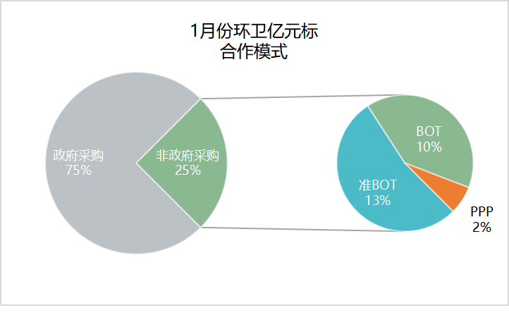 1月份已發(fā)布的60個(gè)環(huán)衛(wèi)億元標(biāo),其中采取政府采購(gòu)模式的項(xiàng)目有45個(gè),采取非政府采購(gòu)模式的為15個(gè),非政府采購(gòu)項(xiàng)目占比25%。