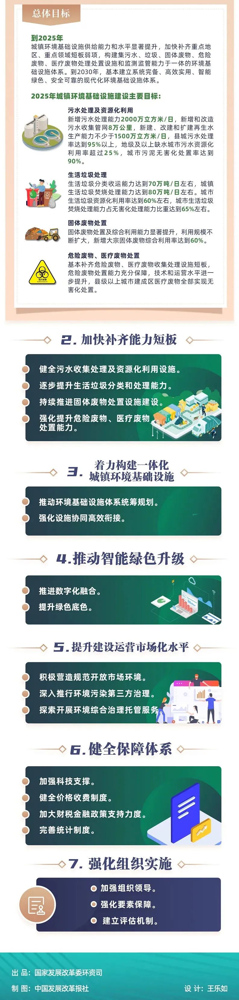 “環(huán)境基礎(chǔ)設(shè)施是基礎(chǔ)設(shè)施的重要組成部分,是深入打好污染防治攻堅戰(zhàn)、改善生態(tài)環(huán)境質(zhì)量、增進(jìn)民生福祉的基礎(chǔ)保障,是完善現(xiàn)代環(huán)境治理體系的重要支撐?!眹野l(fā)展改革委相關(guān)負(fù)責(zé)同志在回答記者提問時介紹,《指導(dǎo)意見》充分考慮現(xiàn)有城鎮(zhèn)環(huán)境基礎(chǔ)設(shè)施工作基礎(chǔ)上,提出到2025年,城鎮(zhèn)環(huán)境基礎(chǔ)設(shè)施供給能力和水平顯著提升,加快補齊重點地區(qū)、重點領(lǐng)域短板弱項,構(gòu)建集污水、垃圾、固體廢物、危險廢物、醫(yī)療廢物處理處置設(shè)施和監(jiān)測監(jiān)管能力于一體的環(huán)境基礎(chǔ)設(shè)施體系;到2030年,基本建立系統(tǒng)完備、高效實用、智能綠色、安全可靠的現(xiàn)代化環(huán)境基礎(chǔ)設(shè)施體系的總體目標(biāo)。明確到2025年新增污水處理能力2000萬立方米/日、生活垃圾分類收運能力達(dá)到70萬噸/日左右、新增大宗固體廢物綜合利用率達(dá)到60%等多項具體目標(biāo)。