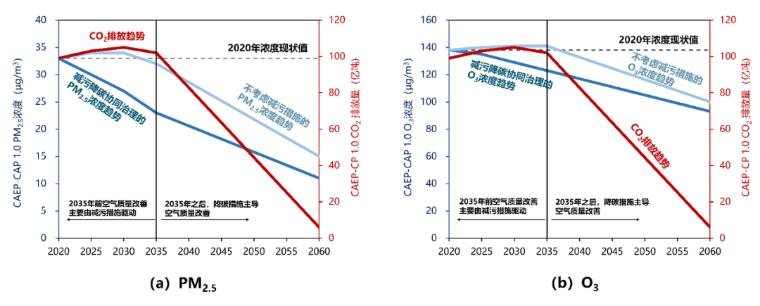 注:PM2.5 濃度為年均值,O3 濃度為 O3 日最大 8 小時(shí)全年濃度第 90 百分位數(shù)全國(guó)均值;數(shù)據(jù)來(lái)源于生態(tài)環(huán)境部環(huán)境規(guī)劃院研究成果 [12]