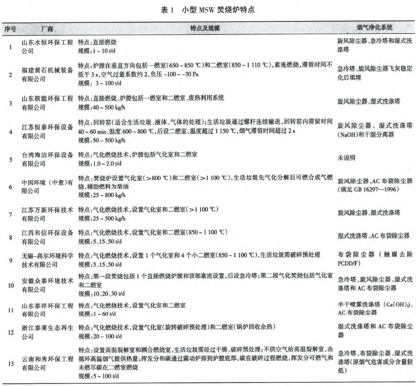 筆者將討論小型焚燒爐的適用原則和運行特點,并對提高環(huán)境污染控制水平提出建議。 國內的小型MSW焚燒爐主要有3種類型:直接焚燒、氣化燃燒和熱解燃燒,典型的焚燒爐產(chǎn)品見表1,處理能力通常小于50 d/t。