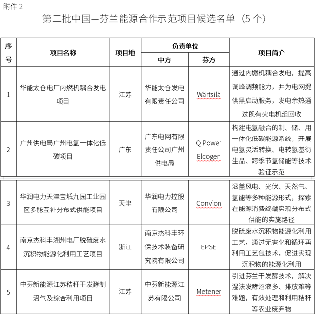 2. 第二批中國(guó)—芬蘭能源合作示范項(xiàng)目候選名單(5個(gè))