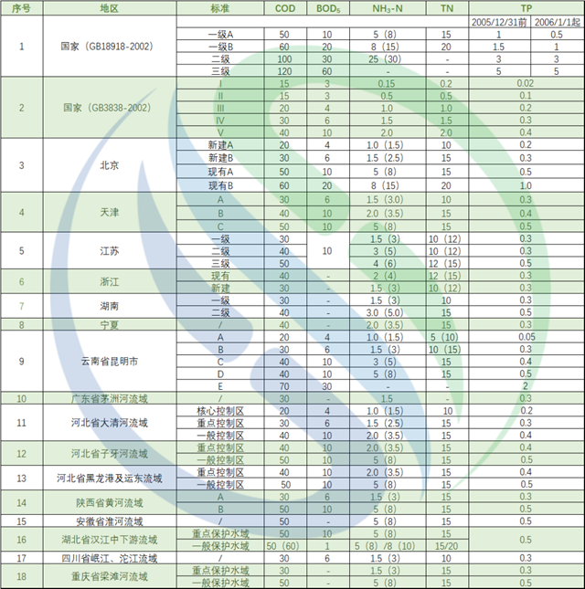 在現(xiàn)行《城鎮(zhèn)污水處理廠污染物排放標(biāo)準(zhǔn)》(GB 18918-2002)和《地表水環(huán)境質(zhì)量標(biāo)準(zhǔn)》(GB3838-2002)的基礎(chǔ)上,北京、天津、江蘇、浙江、湖南、寧夏、云南昆明、廣州茅洲河流域、河北大清河流域、河北子牙河流域、河北黑龍港及運(yùn)動(dòng)流域、陜西黃河流域、安徽淮河流域、湖北漢江中下游、四川岷江沱江流域以及重慶梁灘河流域等陸續(xù)發(fā)布地方城鎮(zhèn)污水/流域污水相關(guān)排放標(biāo)準(zhǔn)。中國(guó)水網(wǎng)對(duì)上述各省、市城鎮(zhèn)污水及流域水污染物排放標(biāo)準(zhǔn)中COD、BOD5、NH3-N、TN以及TP共十八個(gè)標(biāo)準(zhǔn)五項(xiàng)指標(biāo)加以整理匯總并對(duì)比,如有疏漏,歡迎留言補(bǔ)充!