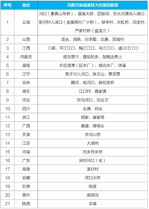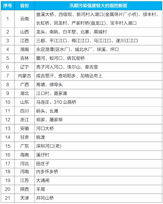 ▼2021年1-10月汛期污染強(qiáng)度較大的國(guó)控?cái)嗝媲鍐?。圖片來(lái)源:生態(tài)環(huán)境部