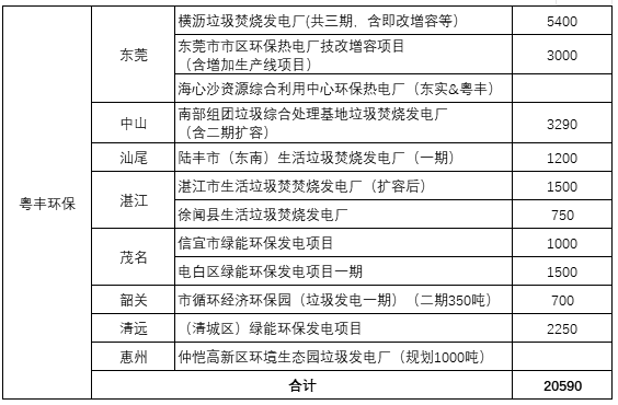 粵豐環(huán)保是國(guó)內(nèi)較早從事垃圾焚燒發(fā)電的企業(yè)之一,2014年在港交所主板上市?;涁S環(huán)保的垃圾焚燒之路起始于2003年——負(fù)責(zé)投運(yùn)橫瀝垃圾發(fā)電廠項(xiàng)目一期工程。借助橫瀝的項(xiàng)目經(jīng)驗(yàn),粵豐環(huán)保開始開拓廣東省內(nèi)其他區(qū)域市場(chǎng)。迄今為止,在廣東境內(nèi),以東莞為根據(jù)地,粵豐環(huán)保已經(jīng)進(jìn)軍中山、茂名、湛江等8市,以日處理20590噸的投運(yùn)項(xiàng)目總規(guī)模成為廣東垃圾焚燒市場(chǎng)的第一名。其中海心沙項(xiàng)目與東莞實(shí)業(yè)投資集團(tuán)合作投資。其所有項(xiàng)目具體列表如下: