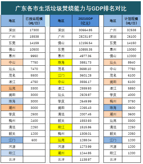 生活垃圾焚燒屬于公共服務(wù),需要政府買單。總的來(lái)看,18個(gè)市的生活焚燒規(guī)模基本與各市的經(jīng)濟(jì)排名相對(duì)應(yīng)。也有一些城市如潮州、梅州、揭陽(yáng)、汕尾等,當(dāng)前投運(yùn)的或者規(guī)劃建設(shè)的焚燒能力遠(yuǎn)超其經(jīng)濟(jì)排位,而一些城市如江門、珠海等,規(guī)劃的焚燒能力則遠(yuǎn)低于其省內(nèi)的經(jīng)濟(jì)排位,其中的風(fēng)險(xiǎn)和機(jī)會(huì)或許值得特別關(guān)注。