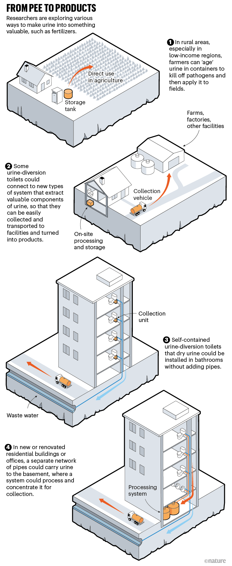分離尿液只是改善環(huán)境衛(wèi)生的第一步。下一步是研究如何處理它。在農(nóng)村地區(qū),人們可以將其儲(chǔ)存在大桶中,以殺死任何病原體,然后將其返田。世界衛(wèi)生組織為這種做法提供了指導(dǎo)方針。