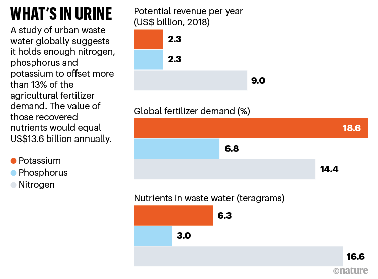 科學(xué)家們說,如果在世界各地大規(guī)模部署,尿液分離將產(chǎn)生巨大環(huán)境與公共衛(wèi)生效益。部分原因是尿液中含有豐富的營養(yǎng)物質(zhì),這些營養(yǎng)物質(zhì)不是去污染水體,而是可以用來給農(nóng)作物施肥或用于工業(yè)生產(chǎn)。根據(jù)Simha估計(jì),人類產(chǎn)生的尿液足以取代目前全球約1/4的氮肥和磷肥;它還含有鉀和許多微量元素(見“尿液中成分”)。此外,不將尿液排入下水道還可以節(jié)省大量的水,并減輕對(duì)老化和超負(fù)荷運(yùn)行的排水管網(wǎng)的壓力。